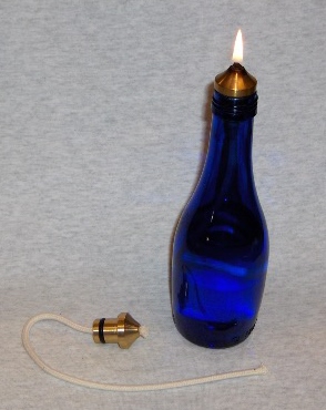 Tyhjennät viinipullon, täytät pullon lamppuöljyllä ja asetat tuikun sydämen pullon suuhun, sytytä teleskooppisytyttimellä. Tunnelmavalo on valmis!