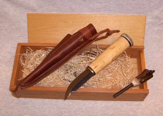 Jätkäpuukko 77 mm terällä, pakattu tervaleppälaatikkoon