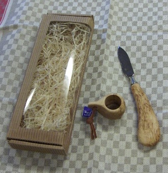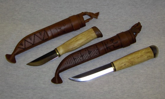 Vuolupuukkoja saa erimittaisilla terillä, kaikissa nahkatuppi. Pakkaus tervaleppälaatikko tai muovirasia
