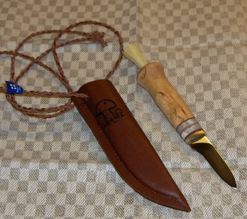 Kotimainen veitsi, visakoivukahva ja nahkatuppi kaulanauhalla