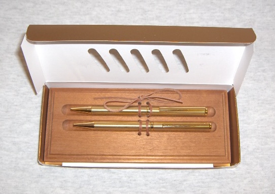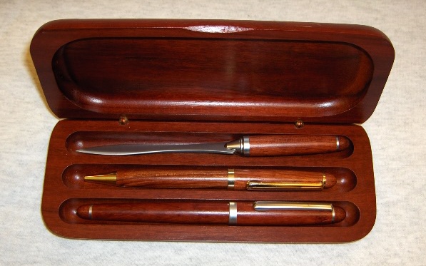 Upea ruusupuusta tehty kynäsetti, kuulakärki- ja lyijytäytekynä sekä paperiveitsi, maailmalla tehty